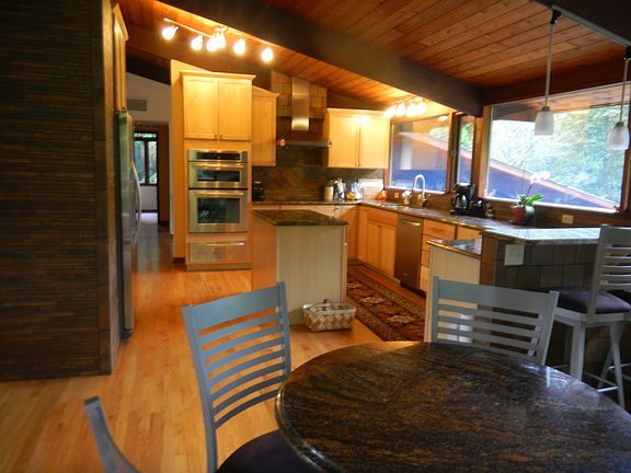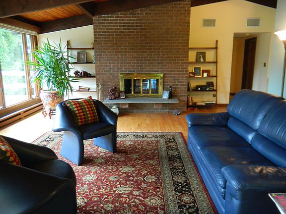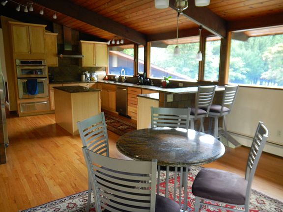 Light & bright open flr plan cedar contemporary w/ wood beamed cathedral ceilings thru-out.Main lvl features HW flrs.Kitchen w/ grnte cntrtps,ss appliances,maple cabinets&breakfast nook.MBR,gst&BR/office & BA on main level.Surround deck looks out on ingrd pool & gazebo.1st lvl walks out to pool and patio,2 BR & BA,wet bar, family rm & FP! 3 bay garage/barn on almost 12 acres!New roof come see it!