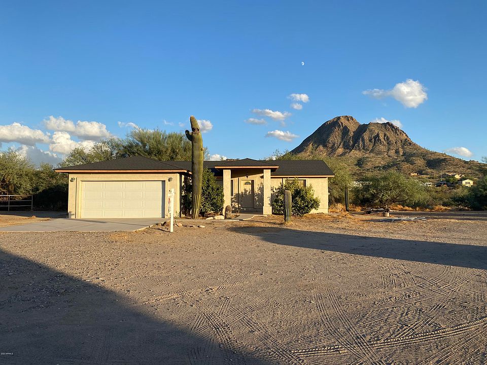 What a sweet deal! Split bedroom floorplan & open concept kitchen/great room. Site built home with 2 car garage & extended concrete pad. Fresh interior paint throughout with all new baseboards & trim. 18' ceramic tile throughout, NO CARPET. 1.8 acres with some wash, plenty of flat usable property. 4 stall covered breezeway barn (4 SMALL stalls or 2 standard) with turn-out, auto waterers & round pen. Lot's of room for toys & trailers. PRIVATE WELL. Easy access to I17, Anthem Outlets, Grocery, banking & hiking trails, State Land, Tonto National Forest & local bars and restaurants.
