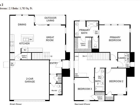 Two-Story Floorplan1,785 Square Feet of Living SpaceOpen-Concept Kitchen, Great Room & Dining Area3 Bedrooms2.5 BathsUpstairs Primary BedroomTwo-Car GarageOutdoor Living Space