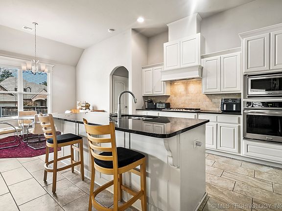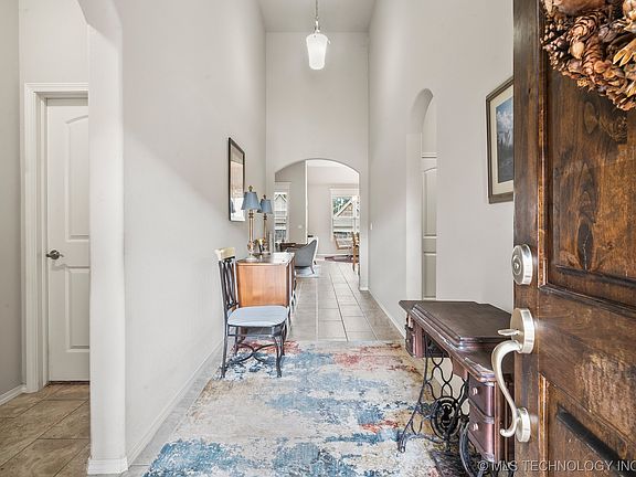 You'll need to come see for yourself this beautiful, well-maintained, cozy home that's nestled in the back of the quite, desirable gated Auberge neighborhood in the acclaimed Bixby School District. This open floor plan boasts a large kitchen with well designed cabinets and storage areas and stainless steel appliances (REFRIGERATOR INCLUDED) The living room has an abundance of natural light, a stone fireplace and flows perfectly with the kitchen island making it ideal and easy for large gatherings. The primary ensuite has vaulted ceilings and is separated from the other 2 bedrooms and offers a separate tile shower, soaking tub, 2 vanities, spacious walk-in closet and has direct access to the laundry room (WASHING MACHINE AND DRYER INCLUDED) Enjoy the luxury of the HOA's fabulous amenities; private streets, club house, fitness area, pool, pond with peaceful fountain and large common area. Spend more time doing what you want and less time tending to outdoor maintenance the HOA takes care of all your front yard mowing, mulching, trimming and watering! Wait there is MORE the storm shelter in the garage conveys with the property as well.