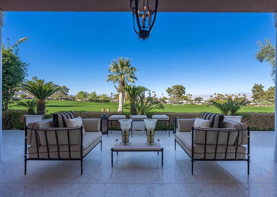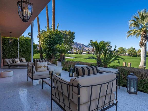 Classic, sophisticated luxury in a prime location! This stunning home delivers a timeless design and combines authentic Hollywood Regency style architecture with state-of-the-art modern features. Nestled in the iconic Marrakesh Country Club and surrounded by unparalleled views of the golf course and mountains, this exceptional home has been fully remodeled and delivers all trends of the present. Attention to every detail, exceptional quality and gorgeous finishes are seen throughout this on-of-a kind home. Terrazzo floors in all living areas and outdoor patios, beautiful wood floors in both bedroom suites, all new double pane sliders, LED lighting throughout, and all interior doors replaced with 10 ft custom solid doors. Completely redesigned galley-style gourmet kitchen features gorgeous full-height custom cabinetry, marble counters, Wolf range & double oven, Fisher Paykel double dishwasher, built-in Miele coffee maker, and the glass door Sub-Zero. Entirely redesigned lavish en-suite bathrooms boast marble floors, oversized marble showers with 10 ft glass doors, luxurious furniture grade vanities with marble counters, and designer fixtures. This is the ultimate dream home of unparalleled excellence that defines the essence of exquisite desert living.