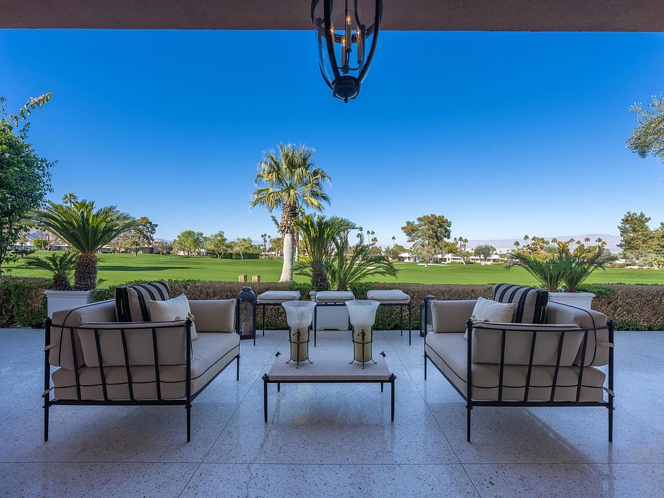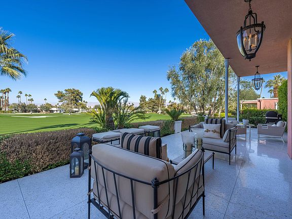 Classic, sophisticated luxury in a prime location! This stunning home delivers a timeless design and combines authentic Hollywood Regency style architecture with state-of-the-art modern features. Nestled in the iconic Marrakesh Country Club and surrounded by unparalleled views of the golf course and mountains, this exceptional home has been fully remodeled and delivers all trends of the present. Attention to every detail, exceptional quality and gorgeous finishes are seen throughout this on-of-a kind home. Terrazzo floors in all living areas and outdoor patios, beautiful wood floors in both bedroom suites, all new double pane sliders, LED lighting throughout, and all interior doors replaced with 10 ft custom solid doors. Completely redesigned galley-style gourmet kitchen features gorgeous full-height custom cabinetry, marble counters, Wolf range & double oven, Fisher Paykel double dishwasher, built-in Miele coffee maker, and the glass door Sub-Zero. Entirely redesigned lavish en-suite bathrooms boast marble floors, oversized marble showers with 10 ft glass doors, luxurious furniture grade vanities with marble counters, and designer fixtures. This is the ultimate dream home of unparalleled excellence that defines the essence of exquisite desert living.