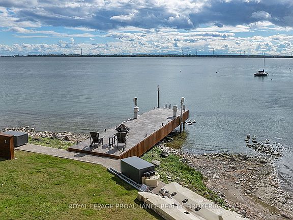 Experience Unrivaled Luxury on the Shores of Lake Ontario. Welcome to your private lakeside retreat - a breathtaking 5,778 sq. ft. masterpiece built by Garofalo Homes, designed to capture panoramic water views and timeless elegance at every turn. Step through the grand foyer with its 18-foot ceilings and immediately feel the sophistication and warmth of this meticulously cared-for home. The main level offers a spacious great room with sweeping lake views, a primary bedroom suite with an ensuite bath, a chef's kitchen, and beautiful hardwood flooring throughout. Ascend the elegant open staircase to find three additional bedrooms, each with generous closet space, and a serene guest bath. The fully finished lower level is ideal for entertaining or relaxation, featuring two more bedrooms, a full bathroom, a private gym, and a heated patio with a 14-foot swim spa-perfect for unwinding while taking in the stunning sunsets. The backyard oasis is a true showstopper, boasting professionally designed landscaping that leads to the private 50' x 12' concrete dock with lighting, power, 2 Sea-Doo lifts, and a 7,000-lb boat lift-expertly crafted by Kehoe Marine for the ultimate waterfront lifestyle. Recent upgrades elevate the home even further: a patterned concrete driveway, smart Lutron lighting system, infrared camera system, 2 new Carrier furnaces, cold-climate heat pumps, and Nest thermostats. The heated 3-car garage includes a gas heater and an external gas generator for peace of mind year-round. Perfectly situated near Amherstview, Parrotts Bay Conservation Area, and just minutes from downtown Kingston's shops and restaurants, this home blends serenity with convenience. With its generous layout and unmatched location, it's an exceptional opportunity for a luxury residence, bed & breakfast, or even a professional home office. Take the first step toward your dream waterfront lifestyle - schedule your private tour and experience Lake Ontario living at its finest.
