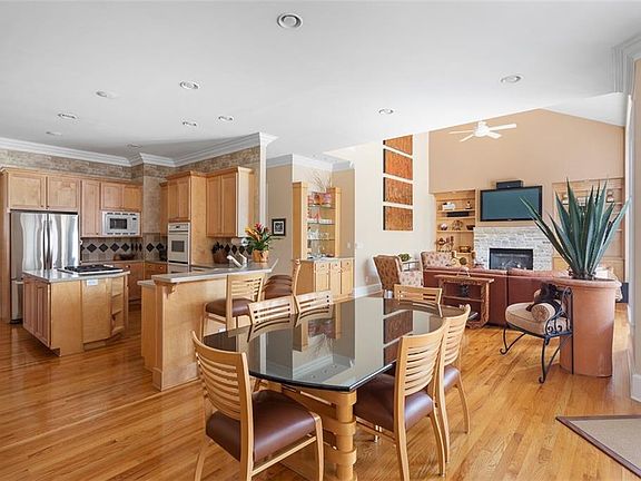 - Kitchen Features: Breakfast Bar, Cabinets Stain, Eat-in Kitchen, Pantry, View to Family Room, Kitchen Island, Breakfast Room, Solid Surface Counters