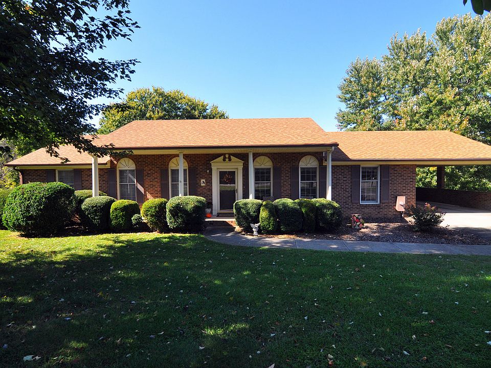 This all brick ranch in a cul-de-sac features a large master suite with private bath and walk-in closet, a bright open kitchen, laminate flooring, two fireplaces, a large den and dining room, 3 full baths, a large basement with a bar, office space, family room and plenty of storage. The exterior features a large deck, patio, fenced yard, double driveway, garden space and gorgeous views.