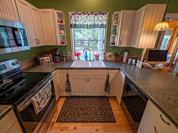 Beautifully maintained 2 bedroom, 1.5 bath home, on 2.38 acres -- perfect for those seeking tranquility and natural beauty. Enjoy a wonderful 3 season room off the kitchen and an enclosed cozy front porch, providing the ideal spots to relax and take in the views. With windows in every direction, you’ll bask in natural light while enjoying the privacy of no direct sightlines to neighbors. Features include main floor living with an open floor plan, radiant in-floor heating throughout and a pellet stove in the living room, ensuring cozy comfort. The property offers a short walking path, decorative pavers leading from the garage to the home, and a charming white picket fence surrounding a small waterfall pond and flower garden. Additional amenities include 3-car garage and a versatile he/she shed, perfect for hobbies or extra storage. This move-in ready home is a nature lover’s paradise in a private neighborhood. Close proximity to ATV trails and several area lakes.