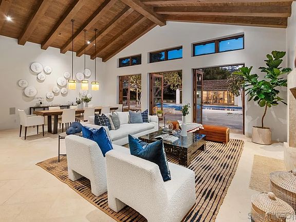 First time on the Market! Incredible & Authentic Spanish architecture living all on ONE LEVEL with modern details & walls of windows to let the Park-Like ambience from the outdoors dazzle the senses! Herringbone Portuguese limestone floors from inside to outside lead you to the full outdoor kitchen with pizza oven, fire pit, hidden outdoor shower, fully tiled pool (lap lane ready to go) and raised spa. CAR Collectors detached garage with hobby room and mechanics bay - easily converted to barn for EQ and access to 60 miles of trails. Detached Guest Home 1 br/1ba with Gym plus full dry sauna & steam room. The quality throughout is the best in class throughout. Ideally located, west Covenant Rancho Santa Fe offering resort-like amenities & set on 3.21 acres and completely fenced & gated, the property provides complete peace and privacy. With oversized living & entertaining spaces and only minutes from the Village, RSF Golf Club & Course, beaches, and shopping, this is the ultimate estate.