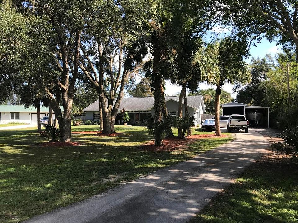 Your little piece of the country awaits you! This wonderful pool home has a brand new kitchen with granite counter tops, 42 inch cabinets, high-end stainless steel appliances and a newly constructed large island in breakfast nook with 180 degree views of the yard and pool. It's been freshly painted inside and out. Master bath totally renovated. Wonderful open floor plan with vaulted ceilings and custom blinds. Pool is screened in with a waterfall and a wonderful covered porch over looking the large backyard with large Tiki Bar and firepit. Extra storage available as well in your huge metal shed as well as covered RV or boat parking. Don't miss out on this listing in Canaveral Groves, it wont last!!!!