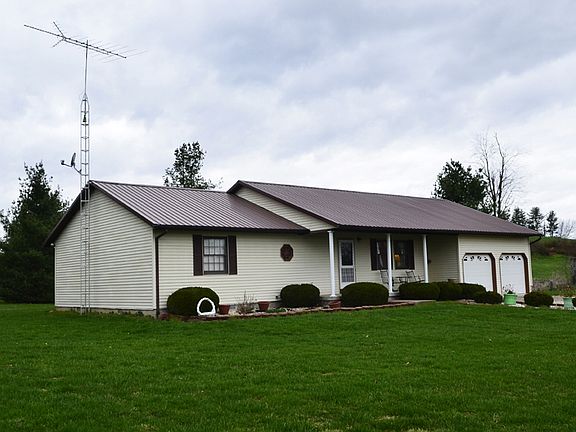 This step saving ranch style home with its easy to care for floor plan is comprised of 3 bedrooms, 2 full baths and a spacious front living room. The kitchen offers a convenient pass through to the dining room, allowing socializing and easy serving of meals. The pride of the present owner are the locally handmade oak cabinets with a large pantry and convenient pull out shelves. A large utility room, spacious enough for a washer, dryer and upright freezer and water heater has a rear exit to the yard making it a great laundry/ mud room. A second door leads to the attached two car garage, so no more struggling with carrying groceries into the house in harsh weather. The master bedroom has a double closet and ensuite bath with a walk in shower and relaxing large soaking tub. All of this on 3.33 peaceful, flat acres with plenty of space for large gardens and outdoor fun! Have a business or a favorite hobby? Ask about the spacious outbuildings. The 28x52 building was an antique shop for many years and the 40x80 garage has been an auto repair business (still has a lift installed) and in past years a heating and cooling business. Both buildings have concrete floors and are heated.