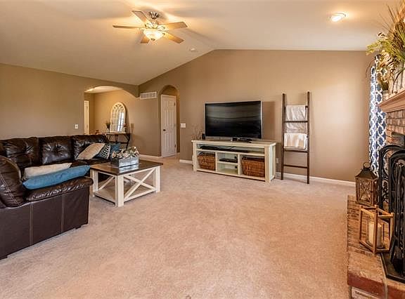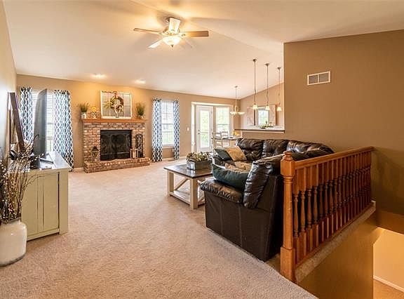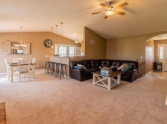 Beautiful ranch with plenty of room for everyone to enjoy. Home features a vaulted living room & breakfast room with a bay window. Step out onto the large freshly stained deck off the breakfast room & enjoy the outdoors. Great room has a fireplace for those cozy evenings. Vaulted master bedroom with a bay window leads to an en suite with skylight & soaking tub with separate shower. New carpet on the main level. Main floor laundry. New architectural roof. Home has been freshly painted in neutral colors that will compliment any decor. 9' pour walk out basement is finished with coffered family room & rec room with a gorgeous custom bar. Walk out to the large patio with extended outdoor entertaining space. Large lot with beautiful mature landscaping. Garage is drywalled & insulated with an insulated garage door with arched windows. America's Preferred home protection plan provided. Walk to Splash Station Aquatic Center on Peine. Close to great shopping and restaurants.