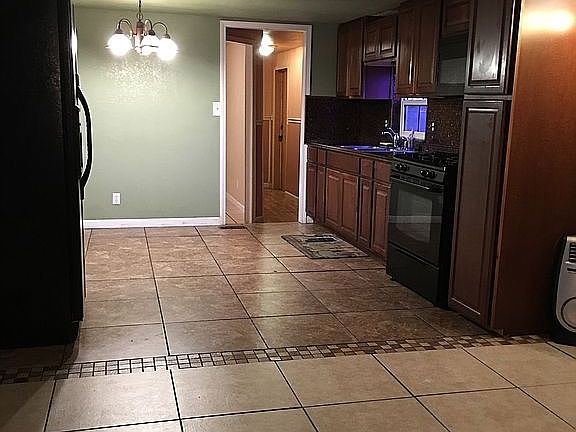 This home has new roof, new double pane windows, new water heater. Step down living room with fireplace all tile floors it is furnished with a refrigerator, gas range, and microwave oven