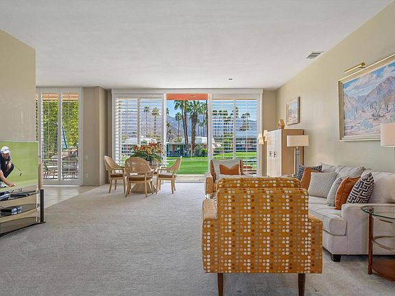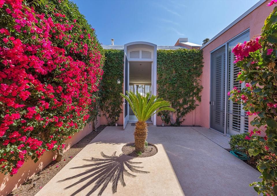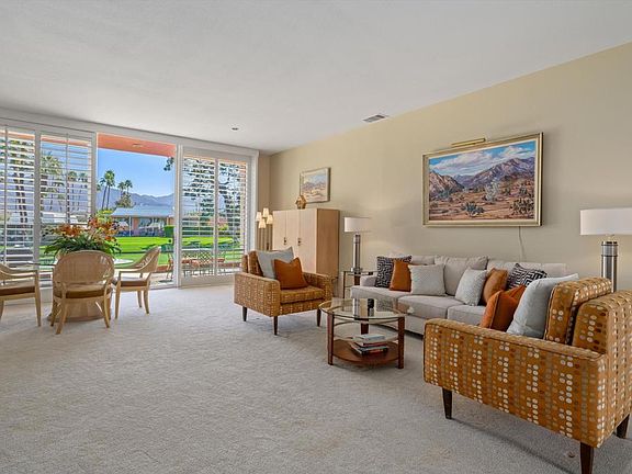 Discover your new desert lifestyle in this spacious 3 BR/3BA home nestled in the highly sought-after Marrakesh. Admire the charm of Hollywood Regency architecture, with delicate ornamental ironwork and captivating pink hues made famous by influential architect's John Elgin Woolf's iconic designs. Indulge in panoramic views of the majestic Santa Rosa Mountains and lush emerald fairways from this prime location within the club. Step through the gated courtyard where grand double doors open to reveal a light-filled living space with soaring ceilings and expansive windows framing the scenic vistas. Entertain effortlessly on the covered back patio, ideal for relishing in the Southern exposure and tranquil desert evenings. Retreat to the spacious Primary Suite boasting a sizable walk-in closet and an en-suite bathroom featuring timeless Marrakesh cabinets. Each Guest Bedroom offers its own private en suite, ensuring comfort and privacy. Positioned close to the clubhouse on coveted Medina Drive, ample guest parking and a sparkling community pool are just steps away. Embrace the opportunity to refresh and enjoy the existing charm or unleash your creativity to craft the ultimate desert oasis. Benefit from the seller's investment in clubhouse renovations over $30K. Explore the wealth of amenities Marrakesh has to offer, including golf, 14 pools, tennis, pickleball, fitness facility, doggie park, and a newly remodeled clubhouse boasting unparalleled views of the San Jacinto Mountains.