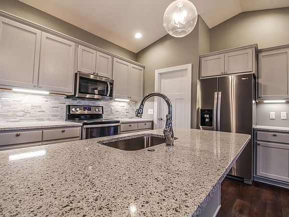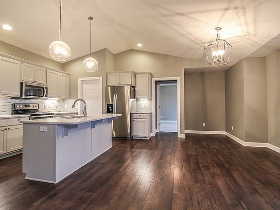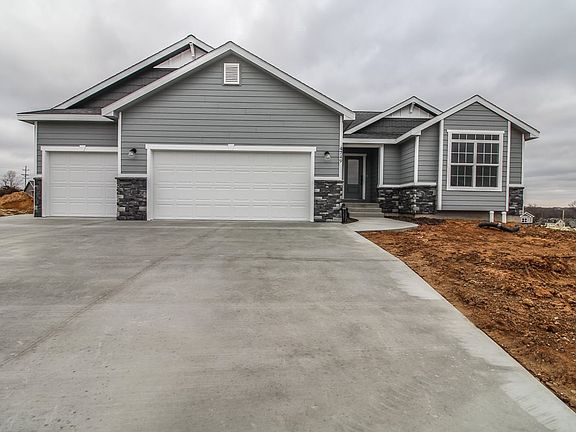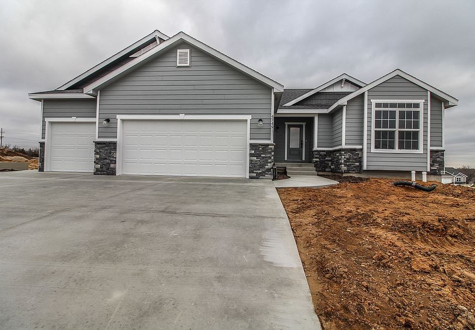 NEW CONSTRUCTION/NEW PLAN by Dirk Cott Construction. Appealing modern decor. OPEN PLAN with vaulted ceiling featuring gas fireplace as focal point of living room. Kitchen is open to spacious eating area and living room. Master suite has nice bath with double sinks, tub and shower, and walk-in closet. Two other bedrooms on main split with bath between. Lower level is walkout with spacious family room, bath and two bedrooms plus 2 unfinished storage areas. 3 car garage with door opener (None on third bay)! Cul de sac living close to Manhattan!