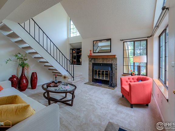 Bright 2nd floor unit, featuring vaulted ceilings and tons of natural light. Large master bedroom with walk-in closet + open, airy upstairs loft which could make a great 2nd non-conforming bedroom or office. Brand new carpet throughout, wood fireplace, washer/dryer. Front door opens to enclosed balcony overlooking lovely grounds, back door leads down to detached 1 car garage. Enjoy community gardens, hot tub, pool & tennis courts or walk to favorites such as Avery and Celestial Seasonings!