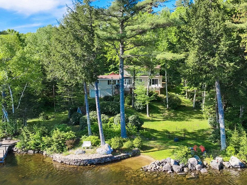 This iconic Pleasant Lake home features a very private shoreline haven with meandering paths through enchanting gardens, a level lawn to the water, a sandy beach swimming cove & deep water dock. Enjoy glistening water views from all principal rooms and the lakeside deck. There are 3 large upstairs bedrooms and options to create additional bedroom space down. Wake up to the call of the loons, enjoy fireworks from your private beach, glide across mirror glass waters in your scull boat or kayak, journey across the lake to Blueberry Island where the kids can dare each other to jump off the biggest Showings start at