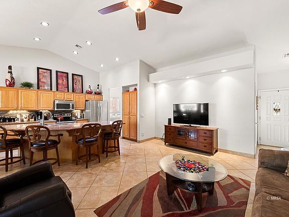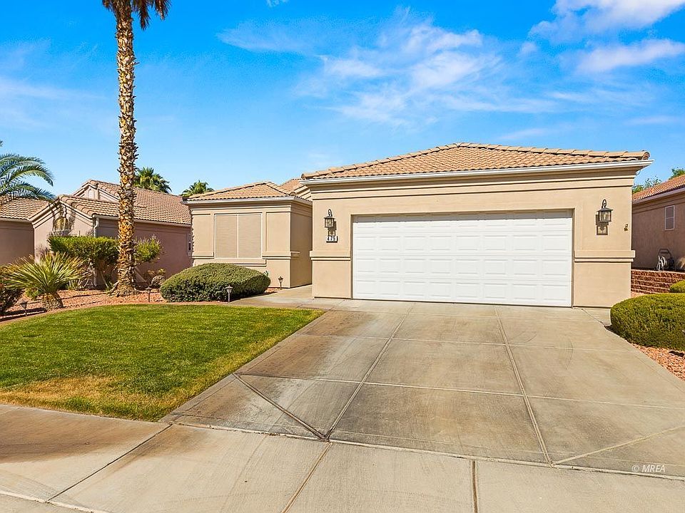 Located in the gated 55+ community of Highland Fairways, this is a version of the 2 BR, 2 BA 1,242sf model you don't find very often: current owners have removed the dividing wall between kitchen and living room to make it a truly open concept floorplan. The kitchen has also been beautifully updated with granite countertops, decorative backsplash and stainless appliances. Kitchen pantry provides lots of storage. Tile floors laid on the diagonal with carpet in the bedrooms. Both bathrooms also feature the upgraded granite countertops. The en-suite master bedroom includes two closets, and the roomy master bath has both tub and shower and double sinks. All appliances stay, including washer & dryer, and there is an R/O system and soft water system. This home has a large garage with a side entrance and a brand-new hot water heater. Fully landscaped back yard. Homeowners also enjoy the amenities at Mesquite Vistas Rec Center, including fitness room, outside pool, tennis courts and more.