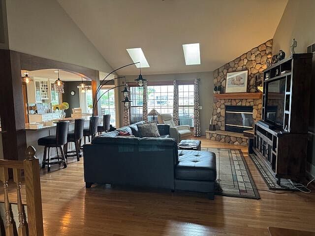 Incredible home & setting on private lake in The Pines. Enjoy spacious ranch home w/ finished walkout lower level. Interior features include cathedral ceiling in great room w/ fireplace & skylights, open floor plan w/ updated kitchen w/ lake view. Luxurious MBR featuring whirlpool tub in Mbath, double vanities & walk in close. Lower level has LBP flooring in large FR/Rec Rm, 4th BR & full bath. 3.5+_car garage w/ epoxy flooring is insulated. Landscaping includes firepit, dock, and composite deck.