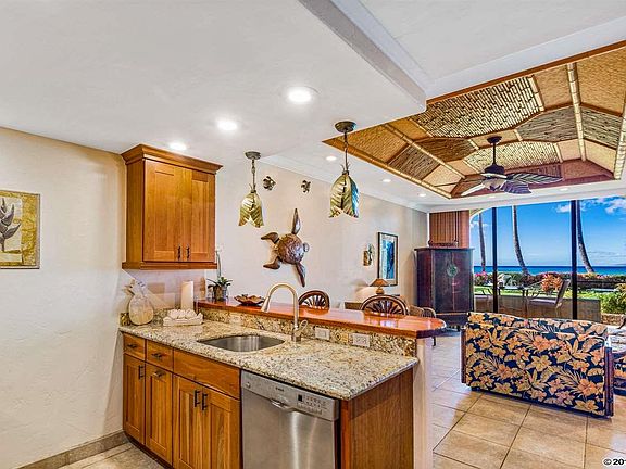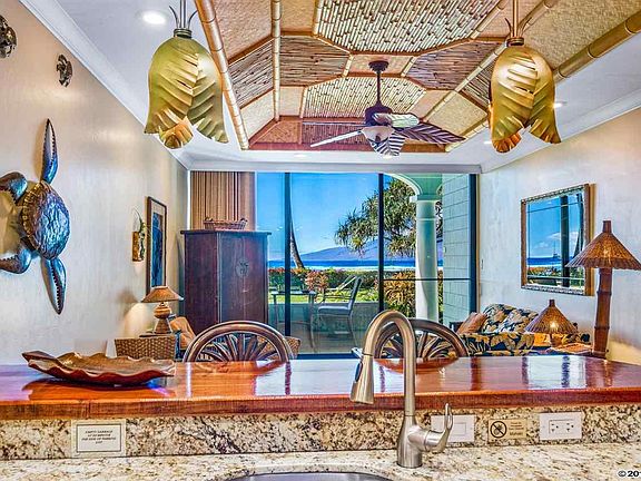 Beachfront Maui! Feel the Aloha in this beach level, one bedroom two bath, 5 star vacation rental condominium. Completely remodeled in elegant Hawaiian décor including granite countertops, custom tile work in the bathrooms, and large tile flooring throughout. Big bamboo cornice molding surrounding an architecturally designed, one of a kind, island style ceiling lends a Hawaiiana charm sure to please the most discriminating Buyer. Complete with Central Air conditioning and your own washer/dryer, this unit is offered turnkey and completely furnished. Skip the elevator as this effortless first floor location keeps everything at your fingertips with ease of access. Just stroll out your beachside lanai across the grass to the white sand beach, pool, or spa. Enjoy the breathtaking sunsets over the island of Lanai, and whales playing in the ocean from the convenience of your living room or beachside lanai. This unit also boasts expansive West Maui Mountains views from your bedroom. Extra storage for your personal items and island toys is an added bonus. Enjoy the rich history of old Lahaina Town as you meander down world famous Front Street. A Polynesian Luau, world class restaurants, surf breaks, boat harbor, activities and events, art galleries, and shopping are all within a half mile radius. Let the onsite concierge located in the elegant lobby curate your island adventures. Embrace your new Maui home!