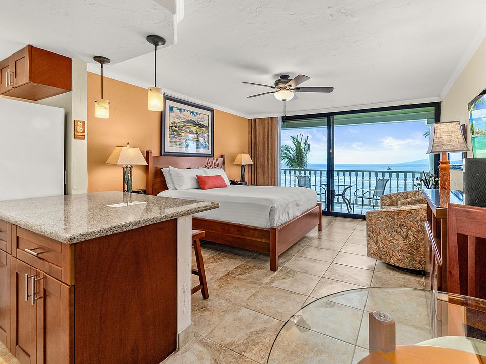 A true Front Street gem! This oceanfront, ocean-facing studio resort condo is beautifully upgraded and has the most beautiful panoramic ocean view! This condo is sold fully furnished and turnkey, and is in a very active rental program with Destination Hotels. Whether you want to relax on the lanai and watch the whales and turtles play, or walk Front Street to enjoy dining and shopping, this condo and its location will please any owner or guest at any time of the year! Amenities include an inground pool and hot tub with outdoor lounging areas, a comfortable setting in the lobby to relax nearby the pool, concierge services, as well as a fantastic sandy beach to enjoy without ever leaving the resort! Lahaina Shores also has additional storage outside available for kayaks or surfboards. If you have an appetite for all that Maui and Front Street have to offer, and you'd like to own your own piece of paradise, don't let this awesome condo pass you by! Call your favorite Realtor for a showing before it's sold!