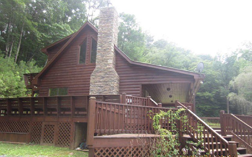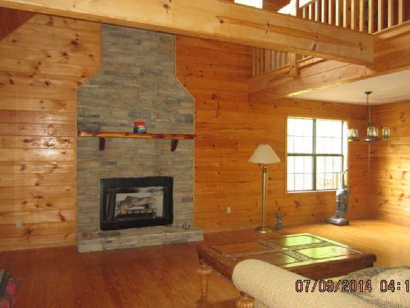 Large yard with branch and pond. Cabin style home with additional loft. Lots of deck and porches.