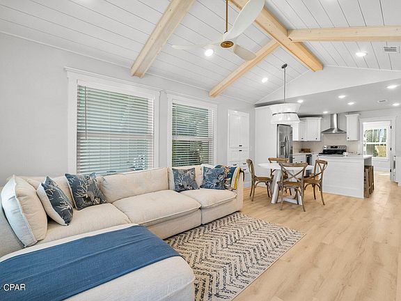 CURRENTLY UNDER CONTRACT, SELLER WILL CONSIDER BACKUP OFFERS Discover a rare opportunity to own in Venture Out! This stunning home has fantastic views of St. Andrews State Park and Grand Lagoon right in your own backyard! This stunning 3-bedroom, 2-bathroom home has been beautifully renovated. Everything is new here including: Hardie siding, new windows, flooring, trim/doors, entire new kitchen and much, much more. The home boasts an open floor plan, allowing for seamless flow between the living, dining, and kitchen areas. The living room features vaulted ceilings with exposed beams and abundant natural light, creating an inviting and spacious atmosphere. The modern kitchen is a chef's dream, equipped with stainless steel appliances, sleek countertops, and ample cabinetry. Each bedroom offers a serene retreat, with the master bedroom featuring an en-suite bathroom with a stylishly tiled walk-in shower and dual vanity sinks. Outside, the charm continues with a cozy patio perfect for enjoying your mornings watching the iconic boats set sail on Grand Lagoon or relax in the evening watching the fishing charters return home.
