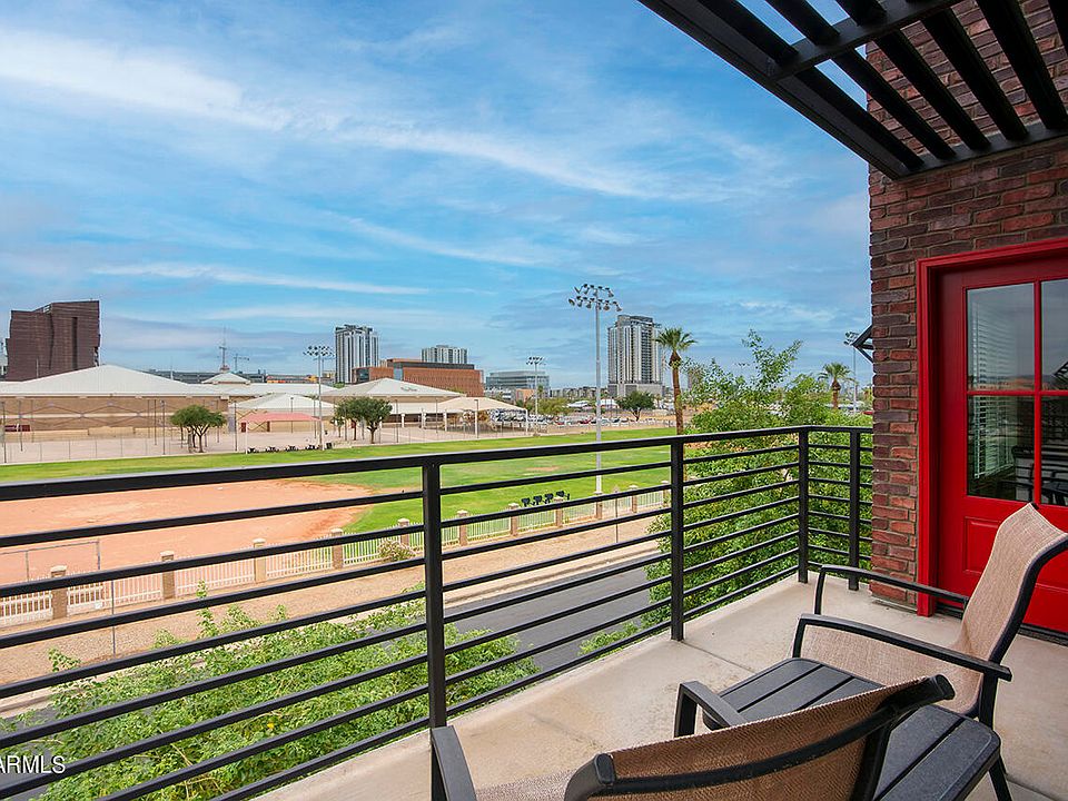 UNICORN ALERT! Welcome to Verde Park...one of the coolest newer condo buildings downtown with AMAZING views! This top floor corner unit has a wraparound balcony takes in all the feels with city light views perched in the treetops with lots of natural light. This one bedroom home features a great sized kitchen, quartz counters, SS appliances, combo w/d unit, luxury vinyl wood plank floors and excellent use of space. One covered parking space and low HOA fees. 2x6 construction with noise reduction materials create a premium quality condominium you will be proud to own. Walk to the park, the light rail, ASU/ UofA, Gallo Blanco, Welcome Diner or scooter over to Roosevelt Row for a night out, you are in the thick of fun in this city. Enjoy!