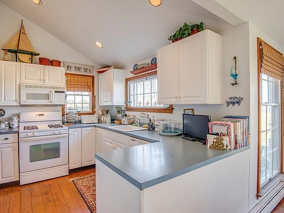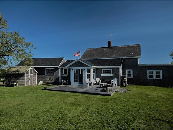 The Captain William Rose House, located on Calico Hill, is a charming property in close proximity to Old Harbor and the beaches. Lovely, expansive views overlooking the Atlantic Ocean, Harbor Pond, and Crescent Beach. The main house has a renovated kitchen and vaulted dining room, both facing the view, as well as a living room, laundry room, and powder room on the first floor. A bedroom and den with separate entrance and a full bath complete this floor. Upstairs there are three additional bedrooms and a full bath. There is a detached three bay garage with plenty of room for storage and a guest suite above. The guest suite has a nice, spacious bedroom, living area, and full bath. In addition, there is a shed to store beach or gardening supplies. There is a pretty yard facing the views to the northeast, as well as decks on two sides of the house. Wonderful property that offers convenience to many of Block Island's attractions.