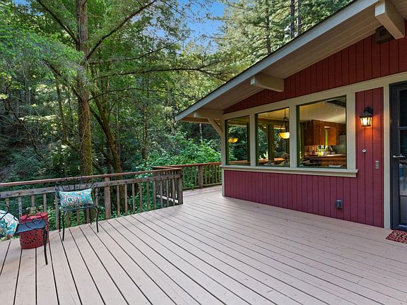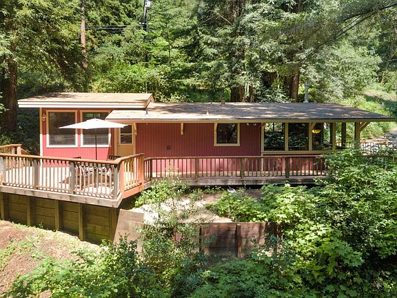Sunny, single level home, situated on almost 2 acres of picturesque forested land. This extremely well kept home features just the right amount of space with 2 bedrooms, 1 bathroom with a tub, a cozy wood paneled living room with a remote controlled gas fireplace, a galley kitchen with newer stainless steel appliances, a light filled breakfast nook with storage bench seating, and an attached laundry room. The large wood deck wraps around the front, side, and back of the house and is the perfect place to sit and have your morning coffee, or gather with friends for a summer BBQ. The home has many recent improvements and modern upgrades including brand new appliances, new central heat and air conditioning, remodeled bathroom, added insulation, newer roof, and fresh paint. Centrally located only 5 minutes from downtown Boulder Creek and 25 minutes to Highway 17/Lexington Reservoir.