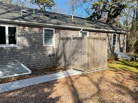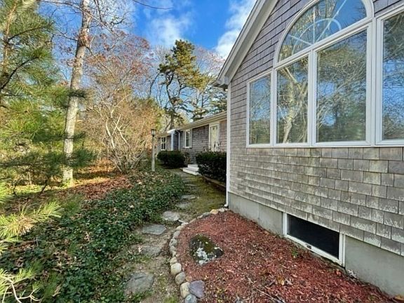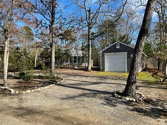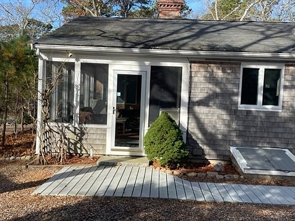 Fabulous move-in-ready Eastham property nestled in private neighborhood. Home surrounded by natural greenery and secluded backyard.Drive to Nauset Light Beach, Coast Guard Beach and National Seashore Visitors Center in minutes. Easy access to Cape Cod Rail Trail. Ocean-side ranch on ½ acre lot features 2 large bedrooms,1 full bath, ½ bath of master. Over 1350 square feet of living space on one level. Interior recently renovated. High-quality finishes including new kitchen with white cabinetry and stainless steel appliances (included in sale), updated bathrooms and den with oversized casement windows with half round transom, spacious living room with gas log fireplace and 2 sky lights, central air, beautiful hardwood floors, vast 3-season sun room and detached oversized garage. Partially unfinished basement for storage with dehumidification system. Custom outdoor shower, town water & well for exterior uses. Newer roof and cedar shingles