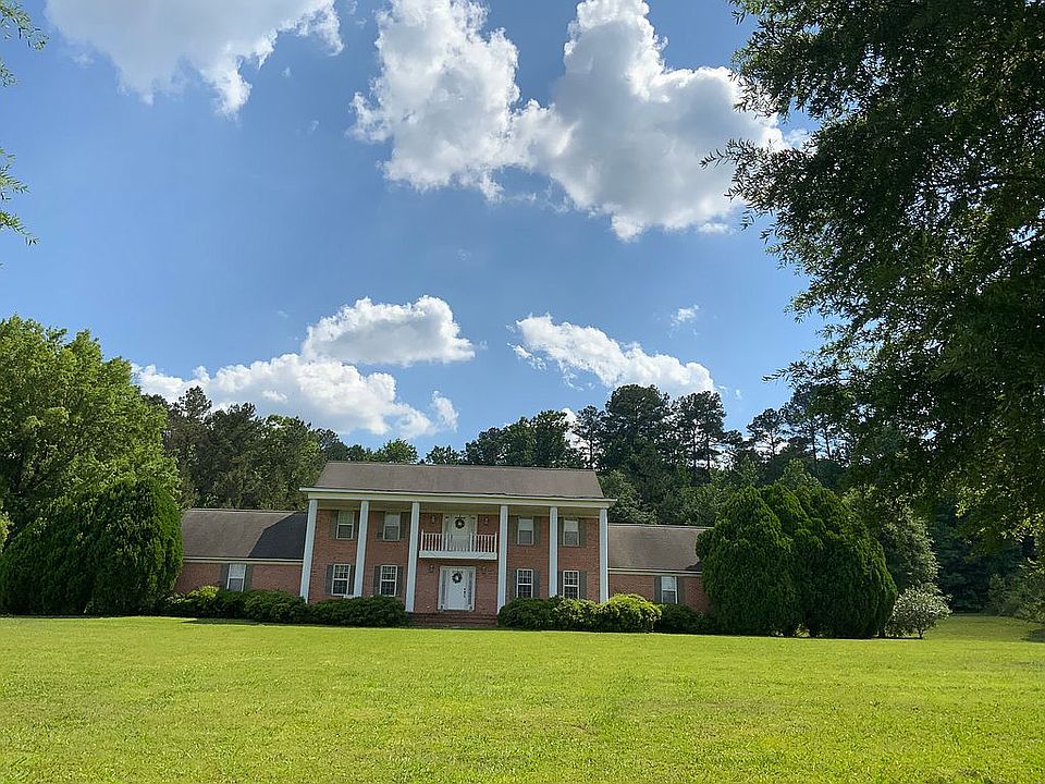 Two-story brick home with 6 tall columns on front porch and accessible small useable balcony. Covered back porch areas with 6 short columns. In-ground 18x36 swimming pool. Large oak trees at sides and in front of home. Total of 5 acres including home with most of the acreage in front of home. Option to buy open and wooded acreage totally over 12 acres connecting to home is available for sale if home with 5 acres is purchased.