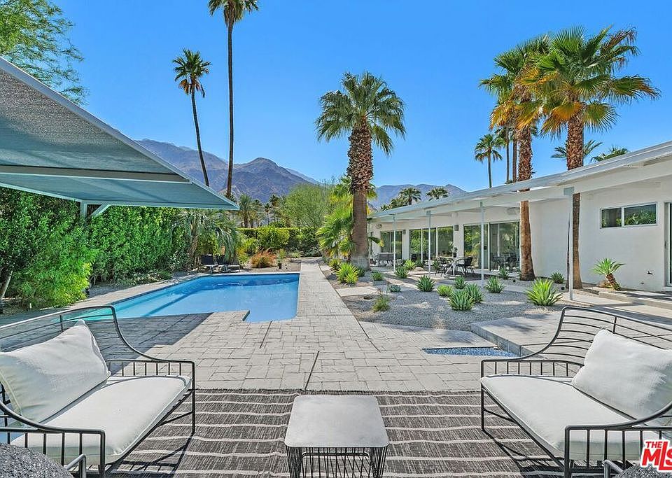 This dramatic Mid-Century home, located in the coveted Old Las Palmas neighborhood, offers complete privacy as well as dramatic views of the San Jacinto mountains. Built in 1955, it was re-imagined by renowned architect Lance O'Donnell, providing both drama and modern flair to the original design. Fully gated and walled, this home is truly an entertainer's delight!! Enter through a secure gate to the front yard with beautiful desert landscaping and a water feature. The front entrance, framed by walls of glass, is highlighted by a dynamic pivoting 6-foot-wide glass entry door. With an open floor plan, the living room, kitchen, and dining room flow seamlessly, providing easy access to the private yard with a beautiful pool, covered lounging areas and mountain views. The gourmet chef's kitchen features stainless steel appliances, glass tiles, quartzite counters, a large pantry and breakfast bar. There are 2 ensuite guest bedrooms as well as 2 primary suites that access a private spa and 2 outdoor showers. Polished concrete floors run throughout the house. A gated driveway leads to the 2-car air-conditioned garage with epoxy floors, EV charger and direct access. With 38 solar panels, 3-zone HVAC, dual-pane windows and LED lighting, this energy-efficient home is ideal for the desert environment.