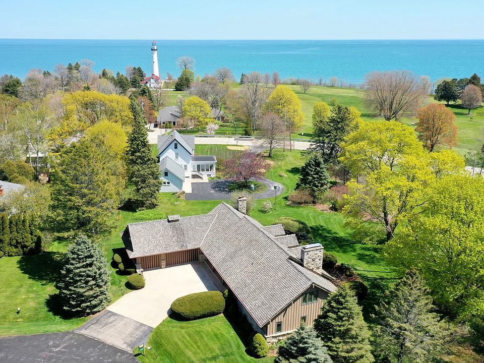 You'll fall in love with this Mid Century Modern with amazing views of Lake Michigan & Shoop Golf Course! Beautiful architectural details, 4 fireplaces & quality craftsmanship throughout. Spacious interior includes: open great room/dining room graced by wall of windows & impressive stone fireplace, 1st floor primary suite complete with walk in closet & en suite bath, executive office with built ins & fireplace. 2nd floor offers 3 bedrooms, full bathroom with additional vanity/dressing room plus a large bonus room. Nestled on a picturesque .55 acre lot in premier Wind Point location just steps from Lake Michigan, Shoop Golf Course & the Wind Point Lighthouse. This is truly a once in a lifetime opportunity!