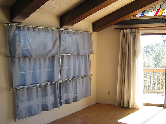 Two story home with upper level decks. A lot of glass for the views. Main living on second floor with 2 add'l BR and bath and family room/library on first floor. Dining area in living room area. On Pinos Altos water system. Over 18 acres of property. Adjoins BLM land. Privacy. Has extra building (studio, etc.) Has metal storage building. Mostly fenced (barbed wire). Driveway gate. Laminate flooring and carpeting. Utility room has hookups for washer and electric dryer. Electric water heater. House has both electric and propane heat. Fireplaces both downstairs and upstairs are Heatolaters ( for extraction of more heat ). This home offers complete privacy.