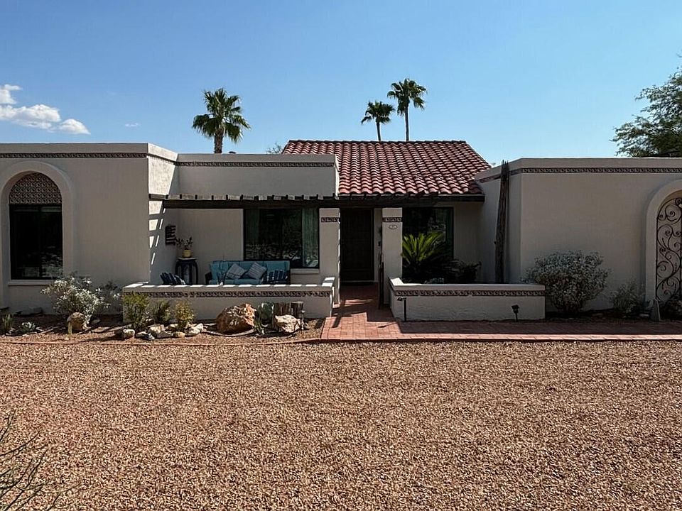 This Catalina Foothills house has 3 bedrooms, 2 full bathrooms, den, living room, dining room, kitchen, laundry, drop zone at back door and a 2-car garage. Outside is like being in your own private resort with views of the Santa Catalina mountains. Al Fresco dinners are relaxing on the back patio overlooking the beautiful gardens, gazebo, pool and spa. This property has many places to entertain both inside and out! The 1979 design as well as the electrical and plumbing were upgraded in 2018. The upgraded list includes kitchen, bathrooms, windows, tile floors, HVAC, water heater, garage door opener, pool, spa, deck, water feature and turf grass. In 2024, the driveway was paved, exterior painted and the flat roof replaced. Solar panels are covered under an existing lease.