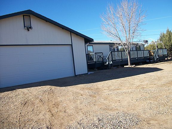 Enjoy peaceful mountain living surrounded by Juniper trees in the hills above Chino Valley. Set on 4 acres of meticulously maintained property, this home has everything you need! 3 bedroom, 2 bath with vaulted ceilings, open floor plan and a large front deck. Plenty of room for family and guests, but if you need more, there is a RV hookup on the side of the garage with available 30 amp and 110 outlet. Wired for Direct TV and internet with good cell phone service. There are rock-lined trails throughout the property and 4 beautifully built bridges that span the seasonal creek. 5 gpm well was installed in 2010, with additional 2500 gal. water storage tank. Covered carport with attached 3 car/2 door pass-through garage/workshop and fully enclosed pen/garden make this the perfect place to live!