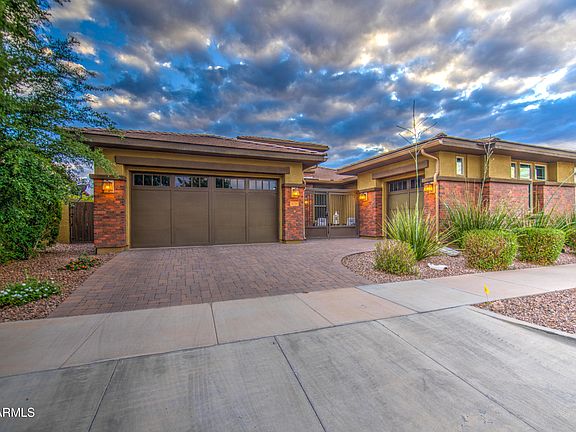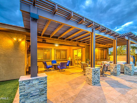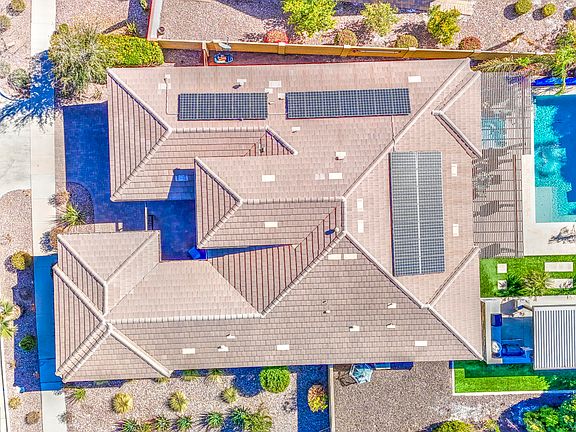 Beautifully appointed home on nearly 15,000 sqft corner lot! This home has 3 bedrooms and 2.5 bathrooms along with a den and extra flex/bonus room. The inviting iron gate leads into a private courtyard up to your grand Iron front door. The gourmet kitchen offers double ovens and gas stovetop perfect for hosting any gathering. The backyard features lots of greenery, two pergolas, fire features, heated and cooled pool with a cover, above ground spa and built in areas for all of your BBQ needs! OWNED solar panels keep utilities lower than most on the hot summer days. This home is a true gem you do not want to miss out on. Enjoy all of the amenities the great community of Eastmark has to offer!