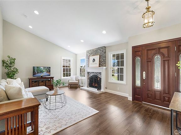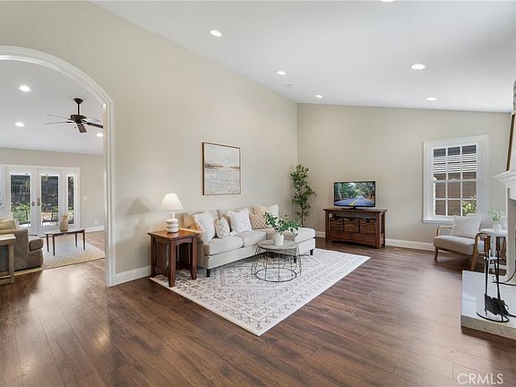 Welcome to your dream home in the Travis Country Community! This beautiful 3 bedroom, 2 bathroom single story house is the perfect blend of elegance and comfort. With approximately 1,533 Sqft of living space, high ceilings, and a spacious layout, the house features a formal living area with laminate floors and a stunning stone fireplace with a marble hearth. Arched entryways add warmth and personality as you step through to the family room and kitchen, creating the perfect hub for family gatherings. The kitchen is an entertainer's dream! Features include a breakfast nook with a bay window, a large island with bar seating, granite countertops, soft-close custom kitchen cabinets, and stainless steel appliances. All the bedrooms can be found on the left wing of the home. As you enter the hall, a full bathroom with storage and an upgraded vanity is on your right with the three bedrooms located towards the end of the hall. The primary suite has vaulted ceilings, an ensuite bathroom with a walk-in closet, dual sink vanity, and a shower with a large soaking tub. Warm wood French doors open up to the beautiful fairytale-like backyard. The laundry room has direct access to the 3-car garage with storage and a workbench area that has plenty of room for tools. This extensive estate is situated on large lot (approx. 13,125 Sqft), with a large front yard plus a garden, trees, and hardscaping. The backyard features a pergola extending off the back slider of the home for filtered shade and a rock path leading to a shaded area under pine trees and a garden area. Located in a highly desirable neighborhood, this home is conveniently situated near award winning schools such as Travis Ranch Middle School and Yorba Linda High School, plus many shopping, dining, entertainment and recreational amenities. Don't miss out on the chance to make this exceptional property your new home!