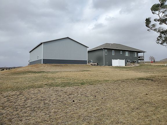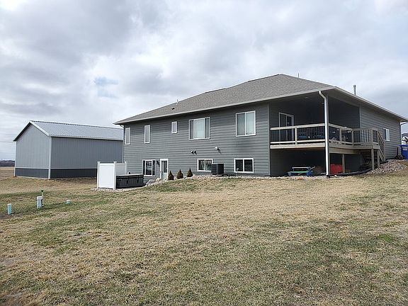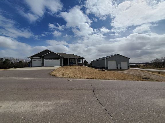 Beautiful acreage with walkout ranch and 36x63ft. shop just 4 minutes North of Sioux Falls. Get outside and enjoy fresh air in the massive backyard. The main level includes engineered hardwood in the kitchen/ dining and family room, luxury vinyl plank in the bathrooms and laundry, and carpet in the three bedrooms. The 9 foot ceilings upstairs are trayed in living room and master bedroom. The large master bathroom has a tiled walk in shower, double vanity, and walk in closet. The kitchen has custom cabinets , granite countertops, tiled backsplash, and a large island. The Andersen windows are covered with Hunter Douglas double cell top down shades and are black out in the bedrooms. The mature tree grove can be seen from the large covered deck. Gorgeous summer sunsets can be viewed from the covered front stoop. The walkout lower level is framed, wired, plumbed, and hvac installed for two additional bedrooms, a theater room, and a third bathroom. Stepout of the lower level onto the concrete patio and then right into Caldera Utopia series spa that can be negotiated in the sale. The attached heated/ finished garage is an oversize triple and the detatched shed is an unfinished 36x63ft pole barn with 14ft sidewalls including 12x12ft and 10x10ft doors. The 1.19 acre lot has all the room you need to get outside and enjoy life. It would cost more than our asking price to build this with today's prices.