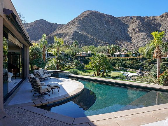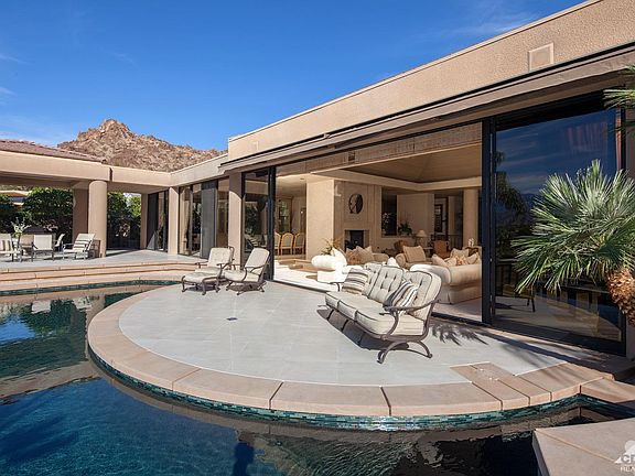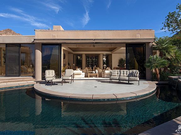 Located on one of The Vintage Club's premier home sites offers compelling views of the best hole in the desert, Number 16 on the Mountain Course. Its views also include the Par 3, Number #17 and down valley toward the Palm Springs windmills and the surrounding San Jacinto Mountains. The home's transitional contemporary styling allows for personalization within to create an environment of elegance to suit any homeowner from mid-century classic. This unique lot allows for picture perfect views from nearly every room within its 7,660+/- square foot home. Outdoor entertaining with built-in barbecue are enhanced by nature's landscape. Steven Chase created this timeless residence that welcomes an intimate dinner for two, a family gathering or a grand party. The magnificent great room includes a step-down living room, media area & sit-down bar. The spacious master suite with walk in closets, glass enclosed gym & office. Three nicely appointed guest suites(one with a luxurious sauna).