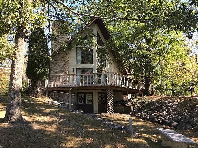 Don't let the water frontage scare you off. There is plenty room for your pontoon to enjoy Lake Lancer. Best of all this home is a beautiful spacious home with plenty of natural light through cathedral height windows. Remodeled with open kitchen and dining, plenty of storage, granite counters, a tiled back drop, pantry and more. Room for large table to hold a crowd. Living room has a beautiful natural wood fireplace and door walls to a wrap-a-around deck overlooking Lake Lancer. 2 bedrooms on main floor and upper floor offers a full master suite with a loft view. Lower level has family room and walk-out to waterfront and a generous 2+ car garage (bumper to bumper) with an attached workshop. With a little TLC the landscape can become a beautiful parklike setting with a gorgeous western view of Lake Lancer. A MUST SEE!