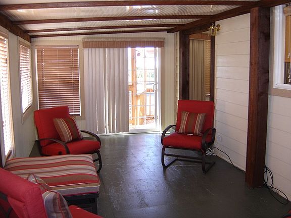 2004 Top of the line Cavco Park Model in like-new condition. 365 day lot, RV hook up, SS appliances, 10'x24' permitted extra room with propane fireplace, detached sun room, storage shed with laundry and added lean-to for extra storage. Good sized front deck. Backs to wetland area for privacy. Low maintenance landscaping. Community amenities include laundry, clubhouse, pool, tennis courts, exercise facilities & play area. $85/month dues include garbage. CC&Rs. Nat. gas available.