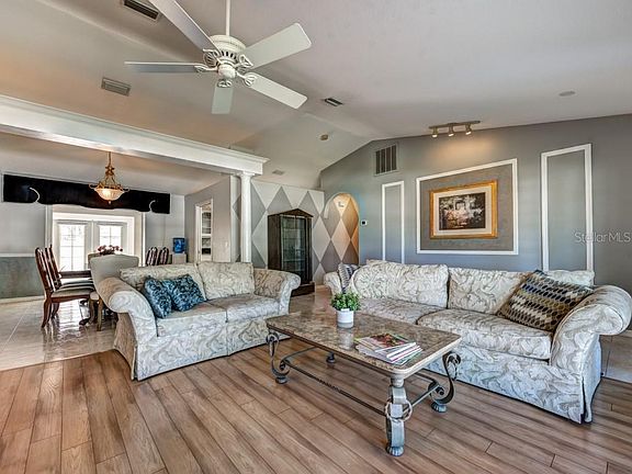 An expanded front porch reminiscent of sipping iced tea in your rocking chair forges a quaint entry to this pristine, move-in-ready 3 bed, 2 bath, 2 car garage residence. Built in 2002, the split floorplan showcases a plethora of designer features. Arched openings to the master bedroom and guest rooms, raised panel interior doors, chair rails, vaulted ceilings, wainscoting, custom painted walls throughout, and more! Flanked by stately pillars, the magnificent living room and regal dining room located across from each other reflect the builder's architectural vision for designing a spectacular home. The theme of sophistication flows into a superb kitchen replete with every functional minutia. Under-cabinet lighting casts a magical hue as black granite counters usher a stunning contrast with white cabinetry and white appliances. The graciously designed Master Suite with his-and-hers closets and beautiful adjoining bath are both adorned with plantation shutters. In the rear of the home, a casual FAMILY ROOM with 2 sets of French doors lead out to a large 12' x 24' private screened lanai. Enjoy total serenity in a private BACKYARD FULLY ENCLOSED WITH PVC FENCING. Additional desirable details include driveway and garage on corner street side, storage shed, underground gutter drains, top-notch water system, and NO Flood Zone! Furnishings Available! Embracing the salt-life is easy with low fee ferry rides to the private beach and boat ramp to the ICW.