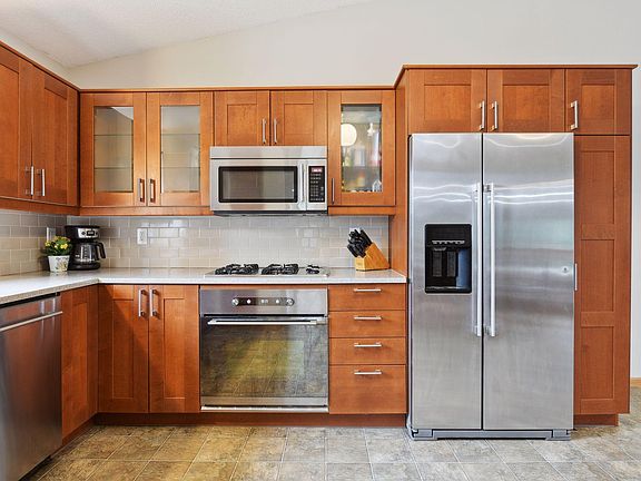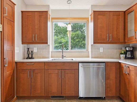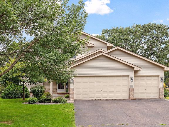 Home sweet home! This modified two-story in a cul-de-sac has an updated kitchen, complete with a tiled backsplash and SS appliances. You will love the open concept main floor with abundant natural light, hardwood floors in the living room and convenient main level laundry. Step outside to your large deck or walk out below to the the patio where you can relax or play in your fenced in backyard. Close to the lakes, parks and paths and easy access to HWY 10 for commuting.