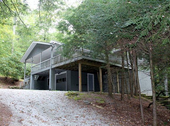 Home located between Highlands and Cashiers located right off the the road on nice wooded lot. Home features open concept large kitchen with wet bar area and large living room. Spacious entertaining area with fireplace, vaulted ceilings, window seats and beautiful built-ins is also located on the main level. 1 bedroom, bath, and garage with ample storage on the lower level and ample parking and turning around room! Large covered porch and deck for entertaining! With a little TLC this property will make the perfect mountain vacation or retirement home in the mountains!