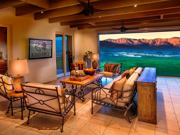 The House on the Hill is perched on a hill overlooking the Santa Rosa Mountains, the Anza Borrego Desert, and the 15th hole of the Rams Hill Golf Course, recently rated the Best Resort Course in Southern CA. by Golf Week Magazine and the #1 course in the country by GolfAdvisor owned by the Golf Channel. Many people believe this Fazio designed course is the best course in San Diego County. Enjoy panoramic views from the 1,100 sf indoor outdoor entertainment room and roof top deck.