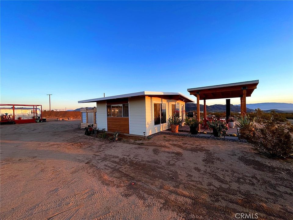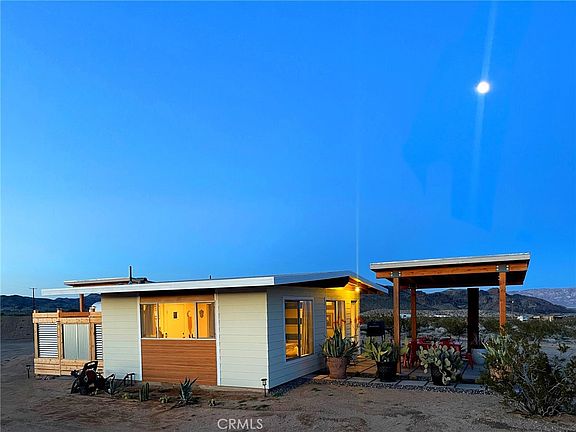 YOU DO NOT WANT TO MISS THIS ONE OF A KIND DESERT OASIS on 5 acres of land! Nestled in the heart of the desert, this unique studio cabin seamlessly blends with its surroundings. This exclusive retreat has been COMPLETELY remodeled inside and out. The exterior boast earthy elements and tones that bring in the natural landscape while the large windows provide panoramic views of the vast desert vistas. Inside, minimalistic design meets comfort, with warm hues, and a cozy workspace as well as sleeping quarters bathed in natural light. Concrete floors throughout the interior not only lend an industrial-chic aesthetic but also serve as a practical choice for the desert environment creating a space that feels both grounded and stylish. The brand new bathroom is a sanctuary of modern design with clean lines and neutral tones. Moving into the open kitchen, it seamlessly integrates with the studio's living space. It's a culinary haven within the tranquility of this desert studio.