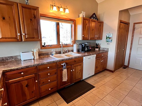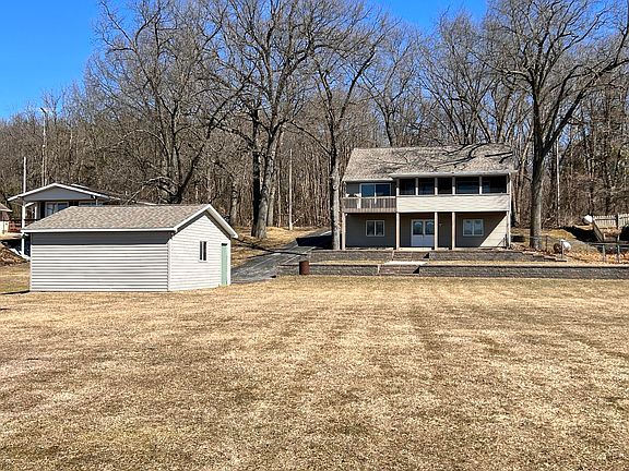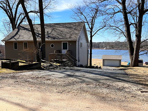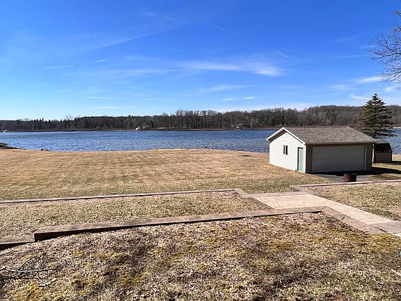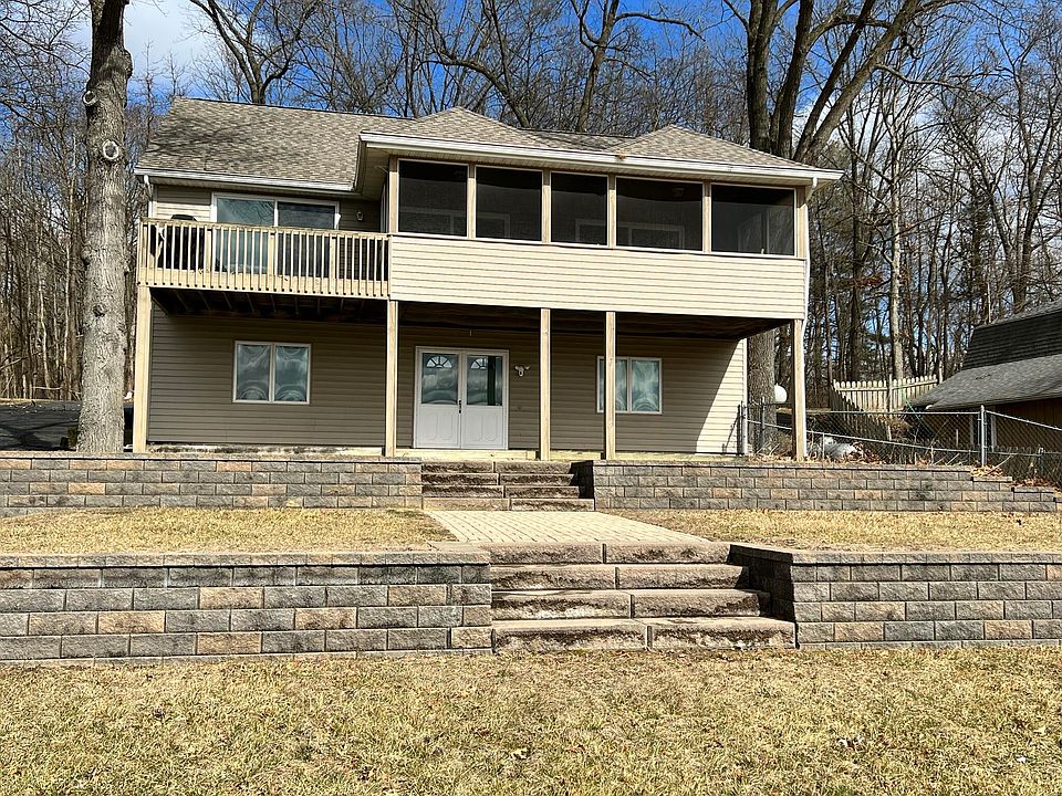 Lakefront Home-190' lake frontage, 5 BR, 2 full baths. Full walkout basement, to covered 400 SF paver patio, 3 BR and full bath. Main floor features open floor plan, knotty pine kitchen with bar stool counter, all appliances. Cathedral ceilings in 40x15 Family Room area, with three door walls to 300 SF screened porch and 100 SF open porch with fantastic view of very nice, quiet, 60 acre limited access lake. Anderson windows and door walls throughout. Furnace, AC and roof replaced in 2020. 2x6 construction. Cement floor crawl space under complete house. Large grass area between house and lake for activities, tiered lot, fenced dog enclosure and campfire pit. Four car garage, asphalt driveway, 4 car parking area at road. Good wading/swimming area for children, dock included.