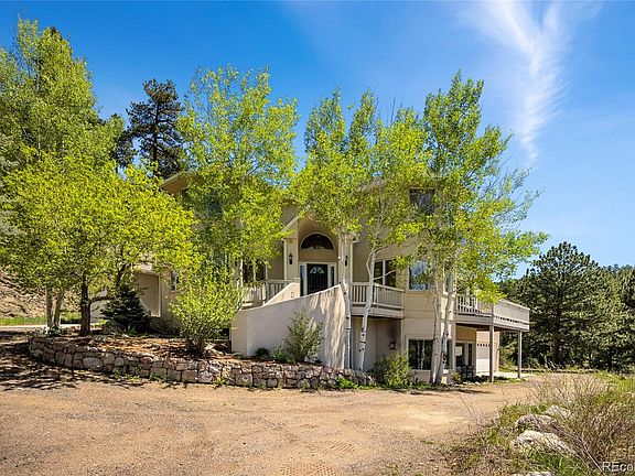 Discover your own private mountain getaway, situated on 22 acres less than 10 minutes from downtown Golden. Marvel at the stunning mountain views visible from the many windows and take advantage of the flagged private trail system winding through the property for endless outdoor exploration. Inside, you'll find a spacious gourmet kitchen complete with a butcher block island, slab granite, a large walk-in pantry, an inviting eat-in area, and stainless steel appliances, all set against gorgeous wood floors. The open living area features a striking stone fireplace and expansive bay windows, offering the perfect spot to soak in the breathtaking scenery. The main level primary suite is a cozy retreat with its own fireplace, walk-in closet, a luxurious 5-piece bath, and private mountain views. Upstairs, there are 3 bedrooms, one with its own private bathroom, and two sharing a Jack-n-Jill bath, as well as two more flex rooms currently used as a yoga/exercise space and office/sitting room. The walk-out basement adds an additional rec room and plenty of storage options. You will find upgrades throughout the home. With two garages—a main level 2-car garage with access to the spacious mudroom/laundry area, and an additional 3-car garage on the basement level—there's ample space for all your vehicles and outdoor gear. This property is a true gem, offering plenty of room to explore via its network of trails. Outdoor enthusiasts will love the proximity to Golden Gate Canyon State Park, White Ranch Open Space, and Mt. Galbraith, all located within a few miles. Despite the secluded feel, it's only an 8-minute drive from a variety of shopping, dining, and recreational options and under an hour to DIA. Plus, the state-of-the-art Lutheran Medical Center coming this fall is a quick 15-minute drive. Snow melts quickly in the winter months due to the south facing driveway. Don't miss this incredible opportunity to enjoy mountain living while staying close to urban conveniences.