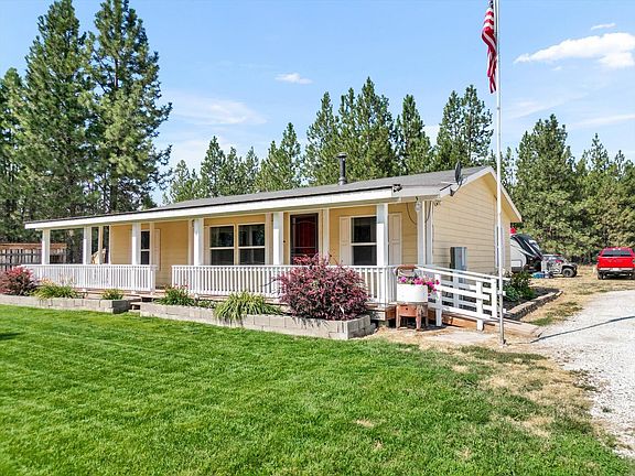 Beautiful updated home on 24 usable acres not far from the quaint town of Springdale (and just 45 mins from Spokane)! This beautiful 3 bedroom 2 bath manufactured home was remodeled in 2023 with all new appliances, vinyl flooring, quartz countertops, AC & heat pump, solar panels, and much more. Enjoy your insulated & powered 24x24 shop (with an office), 12x20 storage shed, fenced garden with a green house, two chicken coups, a "mini barn", & several fences and pens for all the farm animals. Acreage is partially treed and it has two electrical RV hookups. Sit on your wrap around covered porch and enjoy the mountain view and peaceful country life.