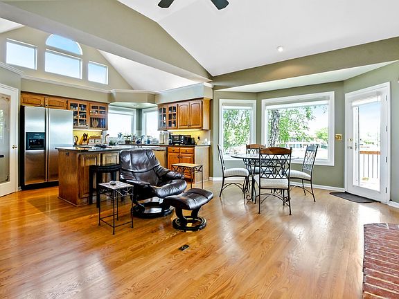 Immerse yourself in resort-style living with unparalleled water views and lakefront access from two sides of the backyard! The Moorings offers an abundance of outdoor activities, including boating, fishing, swimming, kayaking, paddle boarding, and sailing. This exceptional split bedroom ranch features four bedrooms, three baths, and a walkout basement to ground level with 9ft ceilings, plus a large concrete lake room! The formal dining room boasts a tray ceiling, chair rail, wood floors, triple windows and a hutch inset. The spacious living room is highlighted by large picture windows that showcase panoramic lake views, a wood-burning fireplace with gas logs with a whitewood and tile face to the ceiling and wood floors. The spectacular kitchen is equipped with a large island with a Jenn-Air cooktop, a sink with corner windows above that overlook the lake, a Baker's pantry, granite countertops, glass display cabinets, walk-in pantry, vaulted ceiling with stacked transom windows, plant shelves, and wood floors. The hearth room off the kitchen offers a brick-faced fireplace, a built-in desk, a bay window dining area with lake views and wood floors. The fantastic master bedroom features corner windows and a door to the deck with lake views and a luxurious bath with a large Jacuzzi tub with windows above, a separate granite and glass shower, a huge double vanity with granite tops, linen cabinet, and a vast walk-in closet with a window and built-in dresser drawers. On the other side of the home is a large bedroom that boasts a tray ceiling, lake views, and a full bath with a tile shower over the tub and a pedestal sink. A large laundry room with a sink, folding table and a walk-in closet completes the main floor. The basement family room has huge windows, corner patio doors with transom windows, a brick-faced fireplace with a woodbox and bookshelves, a Brunswick pool table and accessories to stay with the home, plus a fantastic wet bar with a full-size frig space. Additionally, there are two large bedrooms with lake views and a full bath with a large vanity plus a hallway linen. A large unfinished area includes a Clearlight Sanctuary Retreat four-person ADA compliant full-spectrum infrared sauna to stay with the home. There is a super lake room/safe room with double doors to the outside and a door to the family room which is perfect for storing all your lake gear. Enjoy stunning lake views on the east side of the home from the huge composite deck with a spiral staircase and patio below plus there is a large yard with patios and lighting at the seawall and a new floating dock. The three-car garage features painted floors, drywalled and painted walls, newer insulated garage doors and windows. Updated items include HVAC in 2016, lifetime Everlast composite siding, Andersen Restoration windows and Grand Canyon roof. The two mounted TVs and the deck furniture to also remain with the home. This type of home that is situated on the point lake lot is rare find, so hurry and schedule your appointment to be able to enjoy a resort lifestyle!